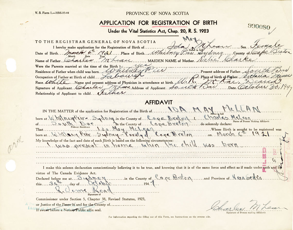 IN THE MATTER of the application for the Registration of the Birth of Ida MayMcLean