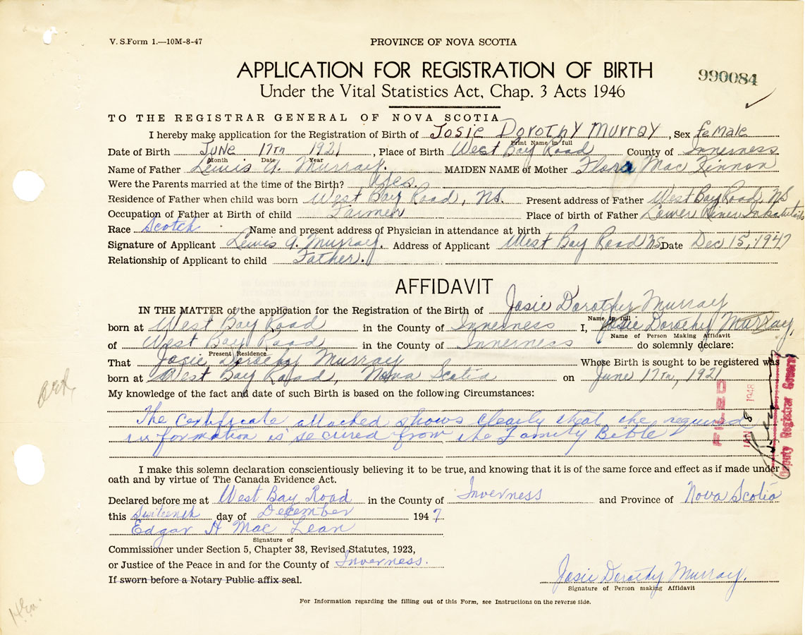 Date of Birth June 17, 1921 Place of Birth West Bay RoadCounty of Inverness