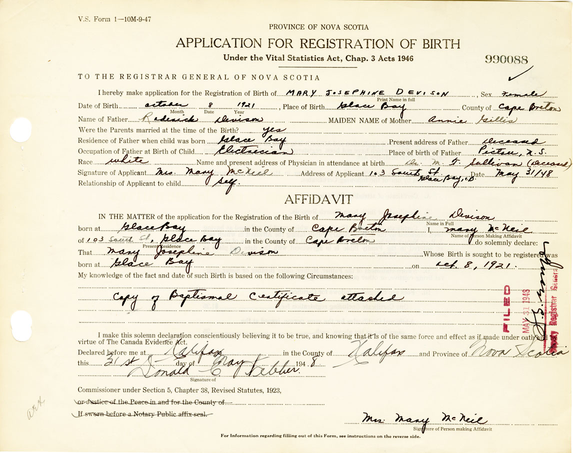 Signature of Applicant Mrs. Mary McNeil Address of Applicant 103 South St. Glace Bay Date May 31, 1948