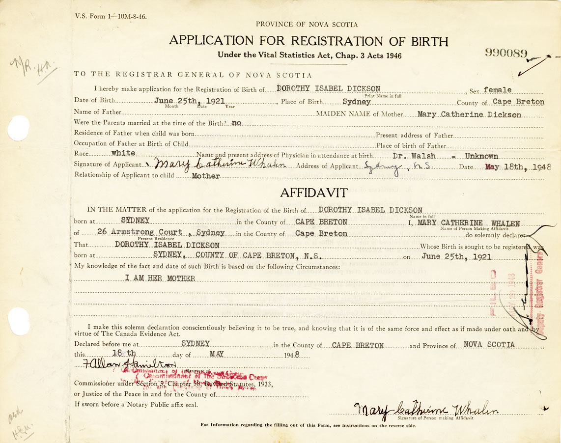 Date of Birth June 25, 1921 Place of Birth SydneyCounty of Cape Breton