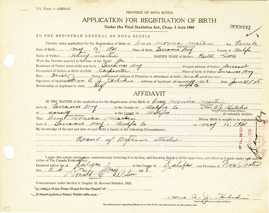 Born at Terrance Bay in the County of Halifax
