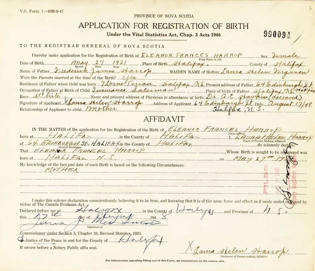 Signature of Applicant Laura Helen Harrop Address of Applicant 64 Edinburgh St. Halifax Date August 17, 1948