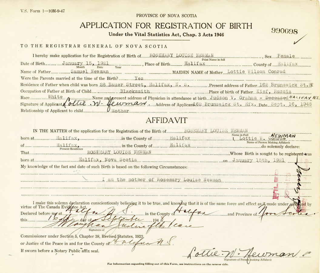 Signature of Applicant Lottie W. Newman Address of Applicant 162 Brunswick St. Halifax Date September 16, 1948