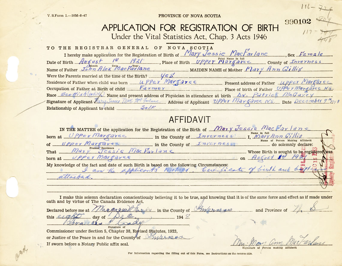 Signature of Applicant Mary Jessie MacFarlane Address of Applicant Upper Margaree Date December 9, 1948