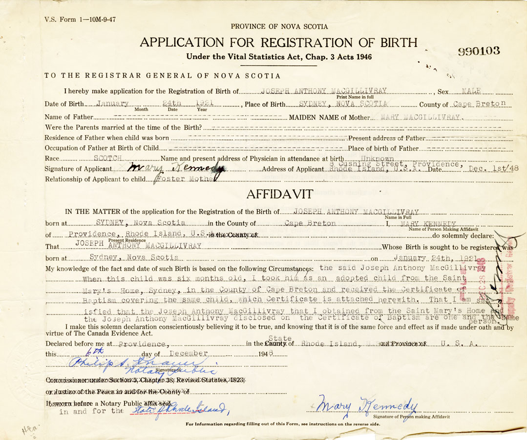 When this child was six months old, I took him as an adopted child from the Saint Marys Home, Sydney, in the County of Cape Breton and received the Certificate of Baptism covering the same child, which Certificate is attached herewith. That I am satisfied that the Joseph Anthony MacGillivray that I obtained from the Saint Marys Home and the Joseph Anthony MacGillivray disclosed on the Certificate of Baptism are one and the same person.