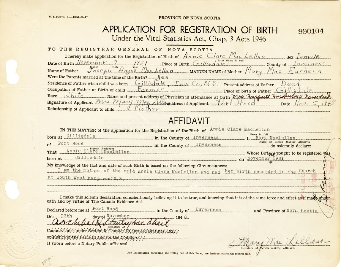 I am the mother of the said Annie Clair MacLellan and her birth recorded in the Church at South West Margaree