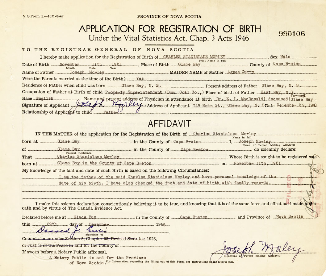 I am the father of the said Charles Stansislaus Morely and have personal knowledge of the date of his birth. I have also checked the fact and date of birth with family records.