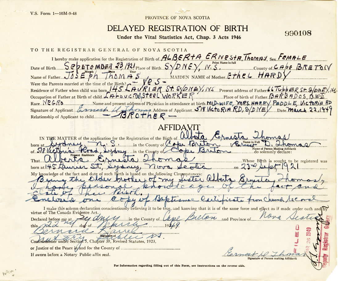 That Alberta ErnestaThomas Whose Birth is sought to be registered was