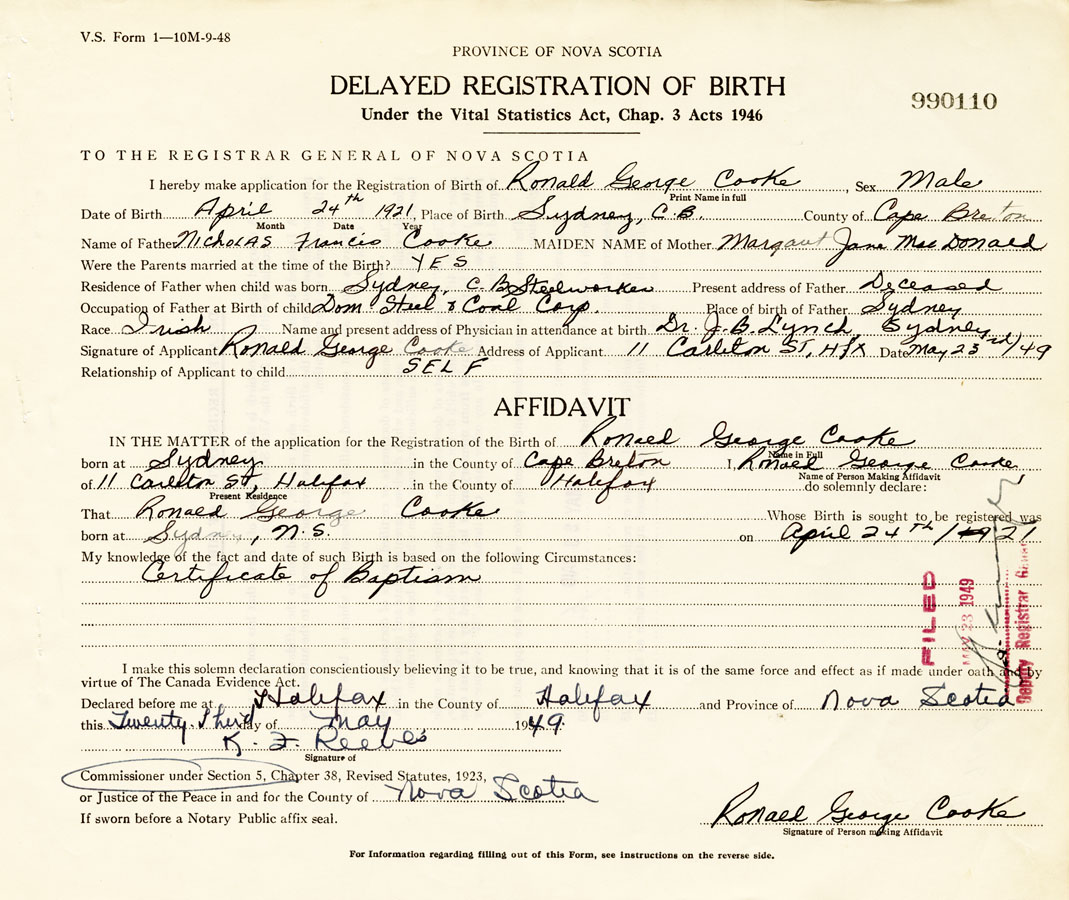 Signature of Applicant Ronald George Cooke Address of Applicant 11 Carleton St. Halifax Date May 23, 1949