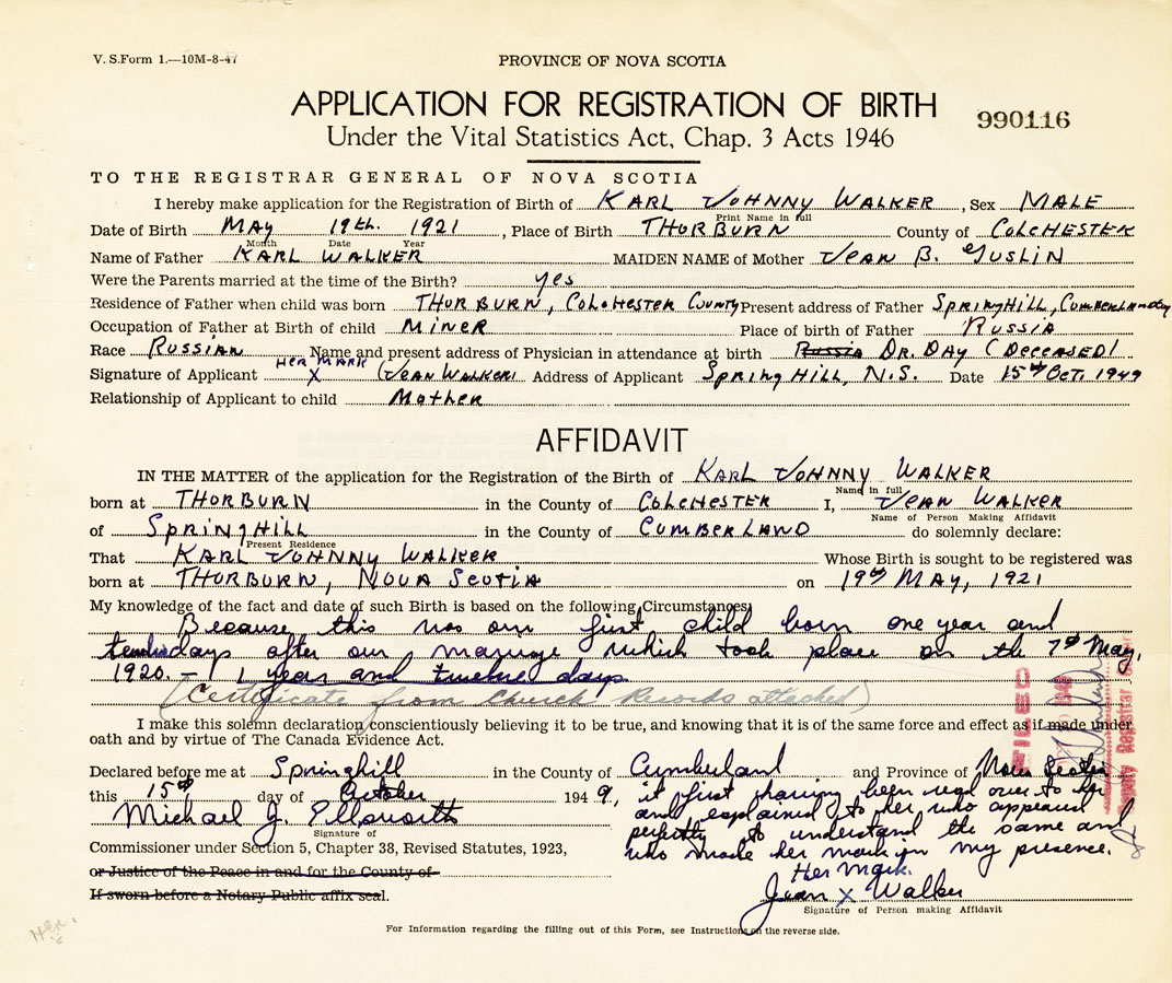 I hereby make application for the Registration of Birth of Karl JohnnyWalker Sex Male