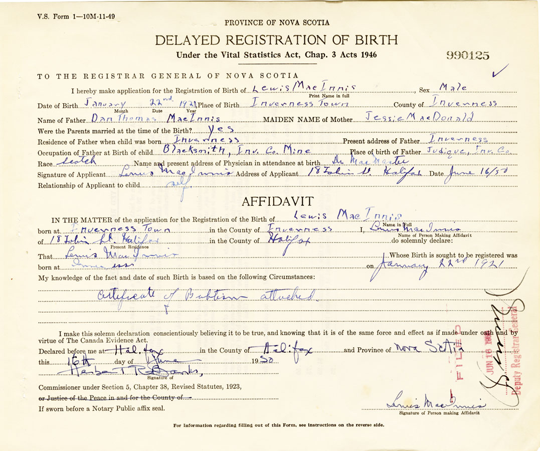Signature of Applicant Lewis MacInnis Address of Applicant 18 Tobin St. Halifax Date June 16, 1950