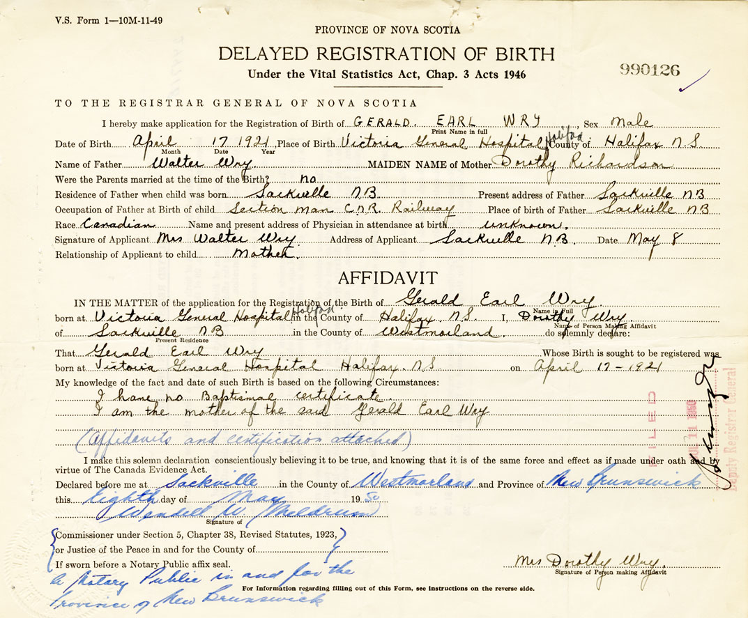 I have no Baptismal certificate. I am the mother of the said Gerald Earl Wry (affidavite and certification attached)