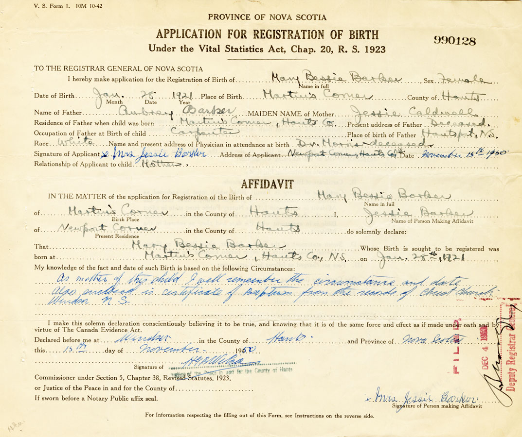 Date of Birth January 25, 1921 Place of Birth Martins CornerCounty of Hants