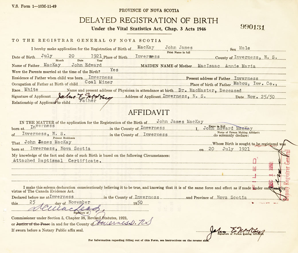 born at Inverness Inverness County on July 20, 1921
