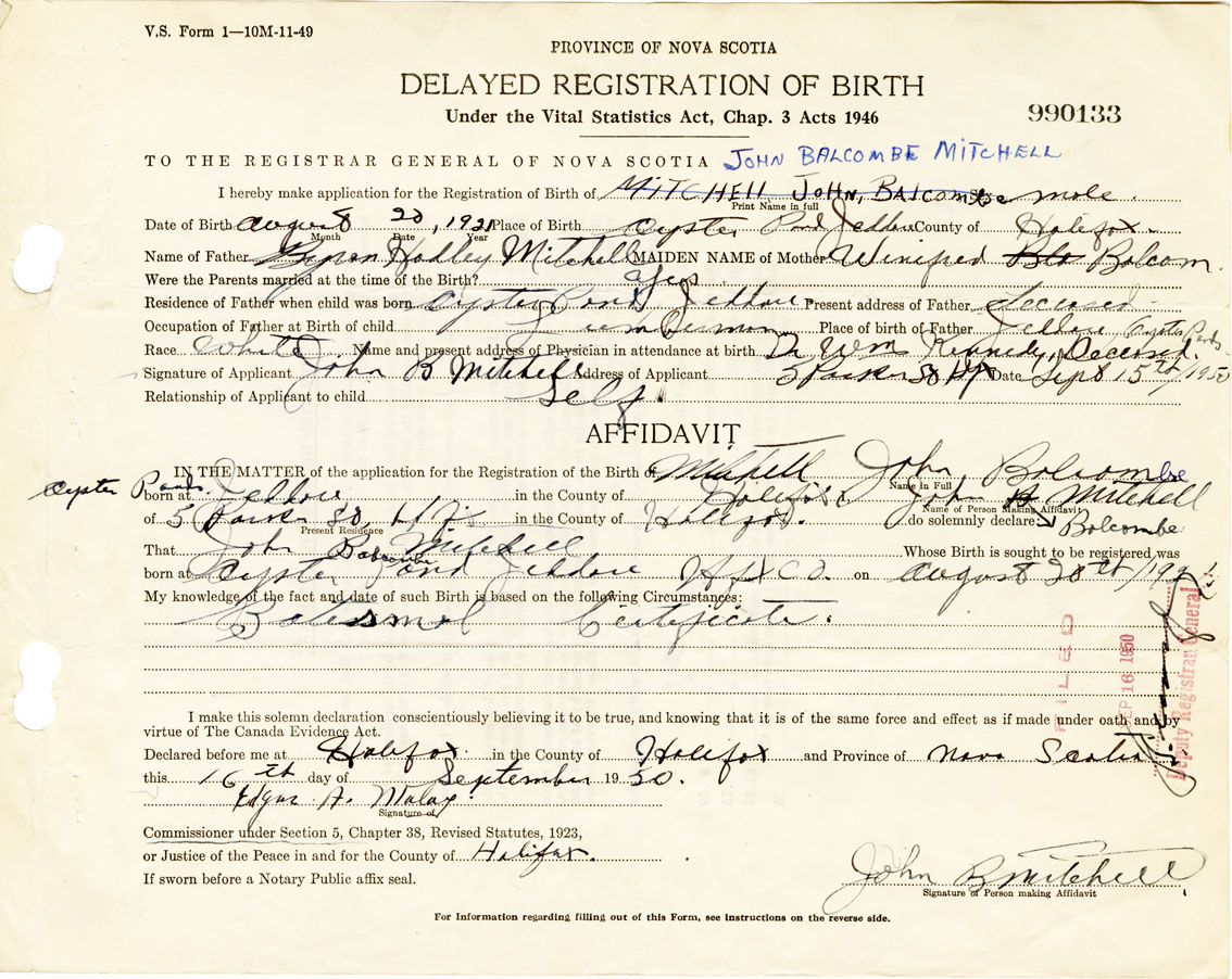 Date of Birth August 20, 1921 Place of Birth Oyster Pond JeddoreCounty of Halifax