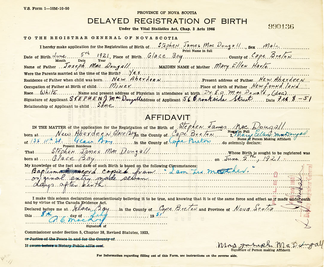 Date of Birth June 5, 1921 Place of Birth Glace BayCounty of Cape Breton