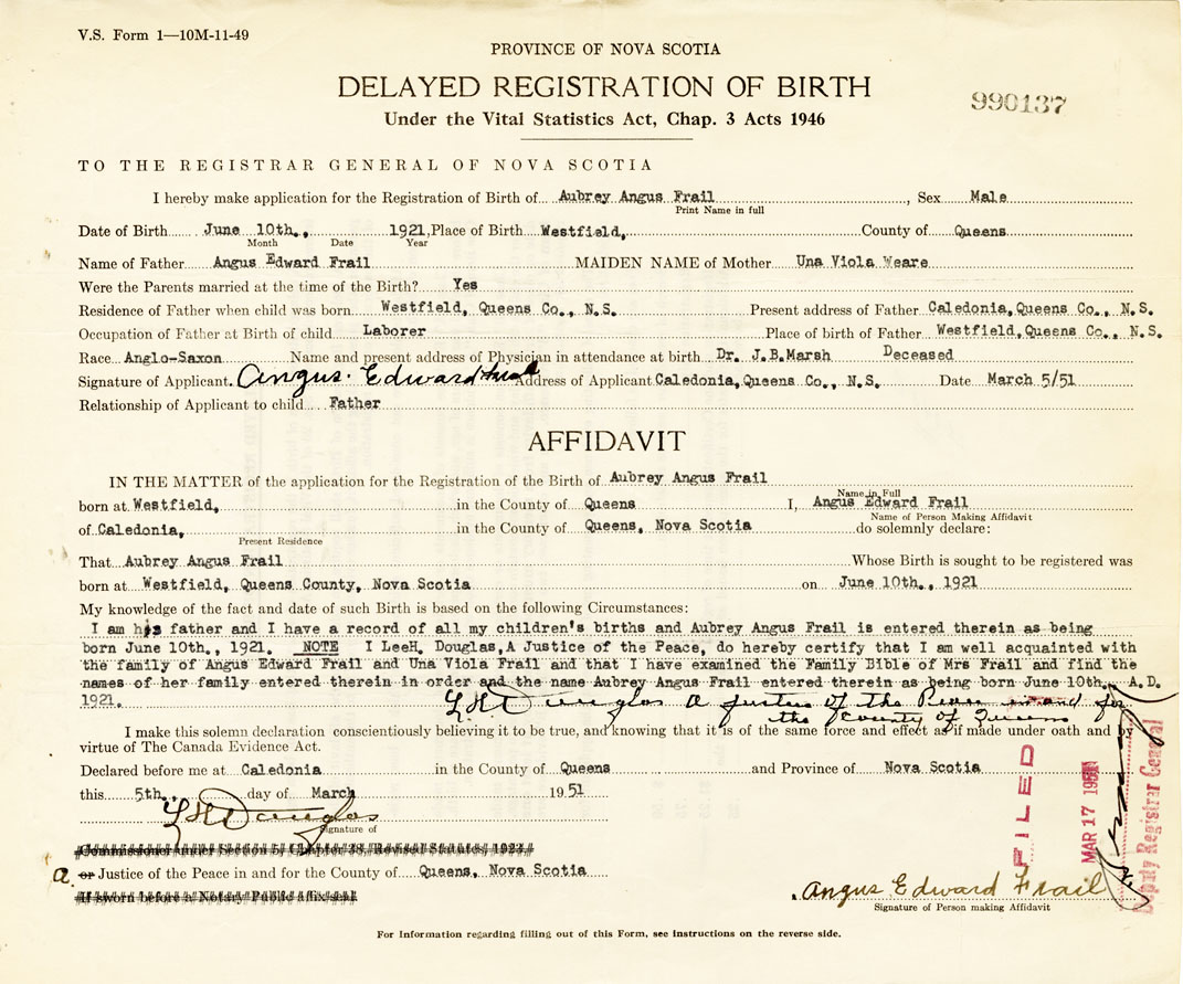 I am his fatehr and I have a record of all my childrens births and Aubrey Angus Frail is entered therein as being born June 10th, 1921. NOTE I Lee H. Douglas, A Justice of the Peace, do hereby certifiy that I am well acquainted with the family of Angus Edward Frail and Una Viola Frail and that I have examined the Family Bible of Mrs. Frail and find the name sof her family entered therein in order and the same Aubrey Angus Frail entered therein as being born June 10th A.D. 1921.