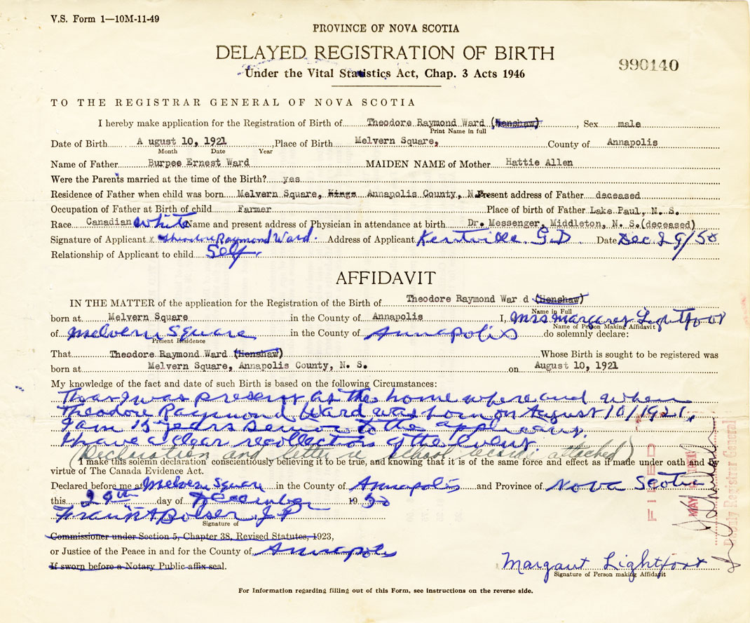 Signature of Applicant Theodore Raymond Ward Address of Applicant Kentville Date December 29, 1950