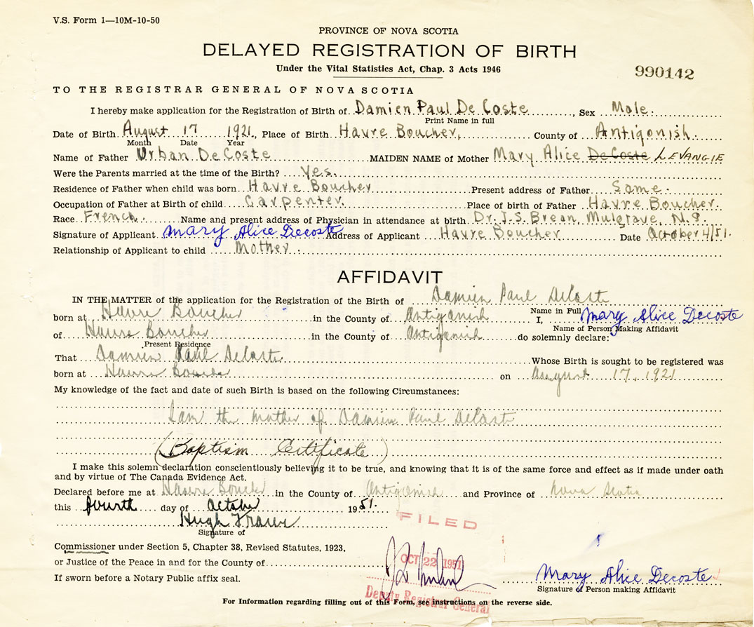 I hereby make application for the Registration of Birth of Damien PaulDeCoste Sex Male