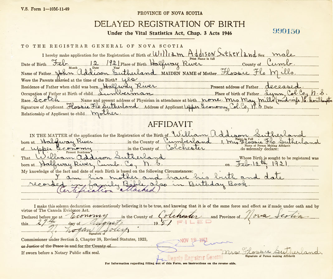 Date of Birth February 12, 1921 Place of Birth Halfway RiverCounty of Cumberland