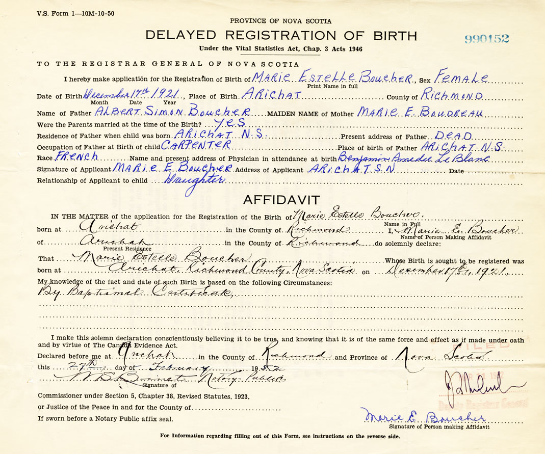 I hereby make application for the Registration of Birth of Marie EstelleBoucher Sex Female