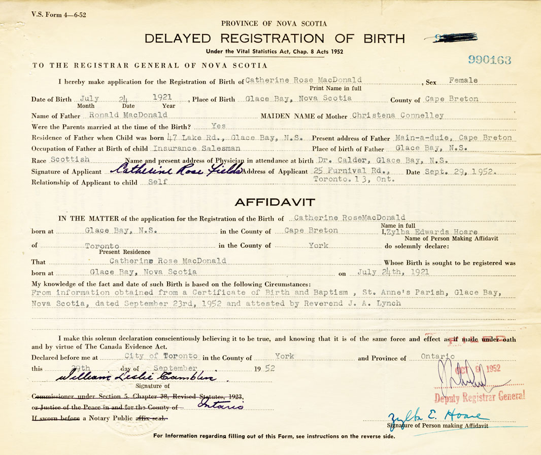 Signature of Applicant Catherine Rose Fields Address of Applicant 25 Furnival Rd. Toronto, Ontario Date September 29, 1952