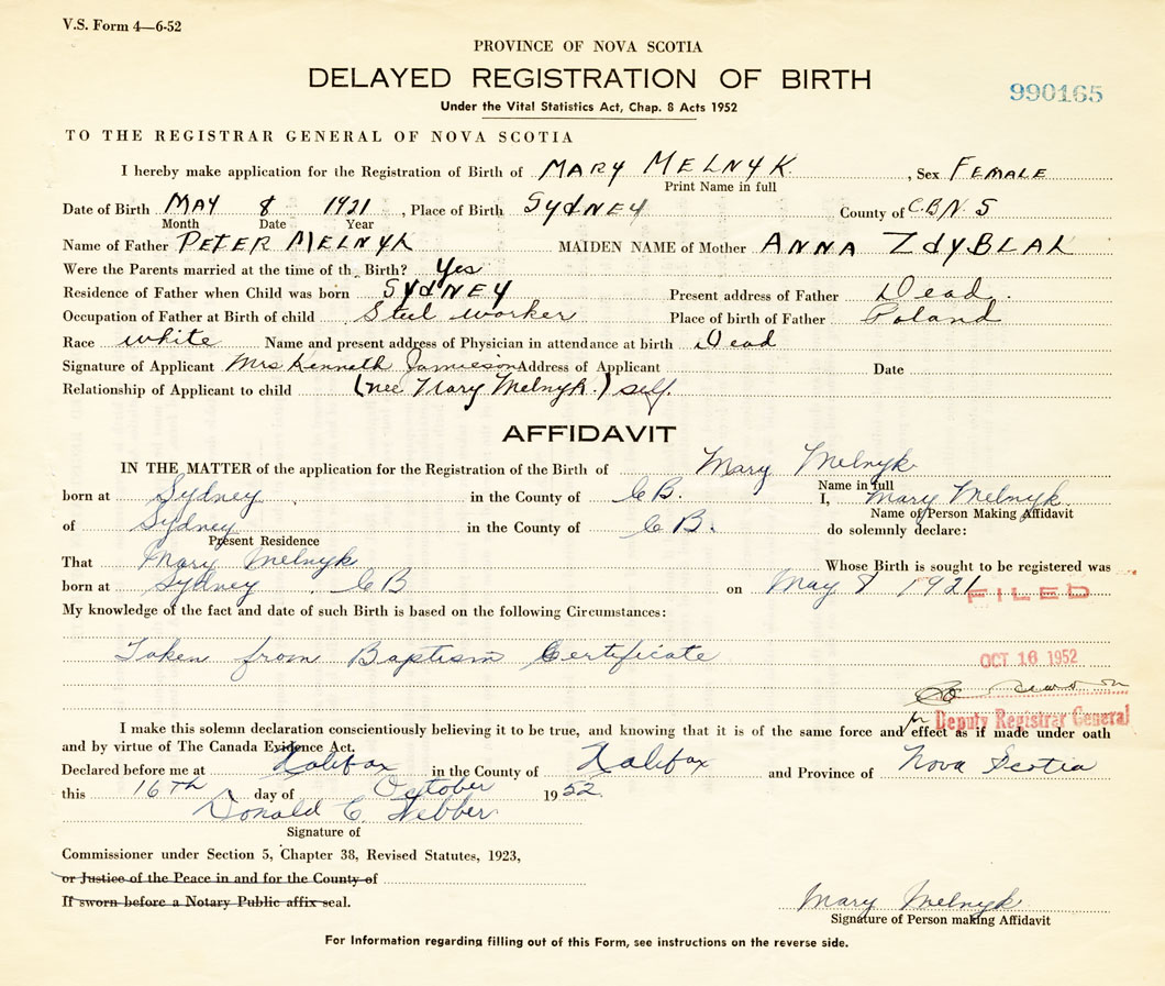 I hereby make application for the Registration of Birth of MaryMelnyk Sex Female