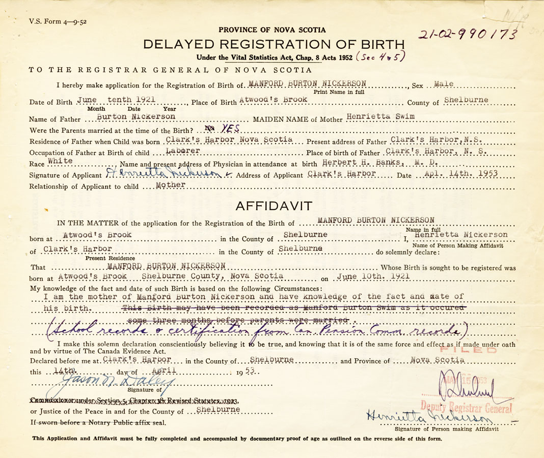 I am the mother of Manford Burton Nickerson and have knowledge of the fact and date of his birth. (School records and certification from Canadian Pension Commission records)