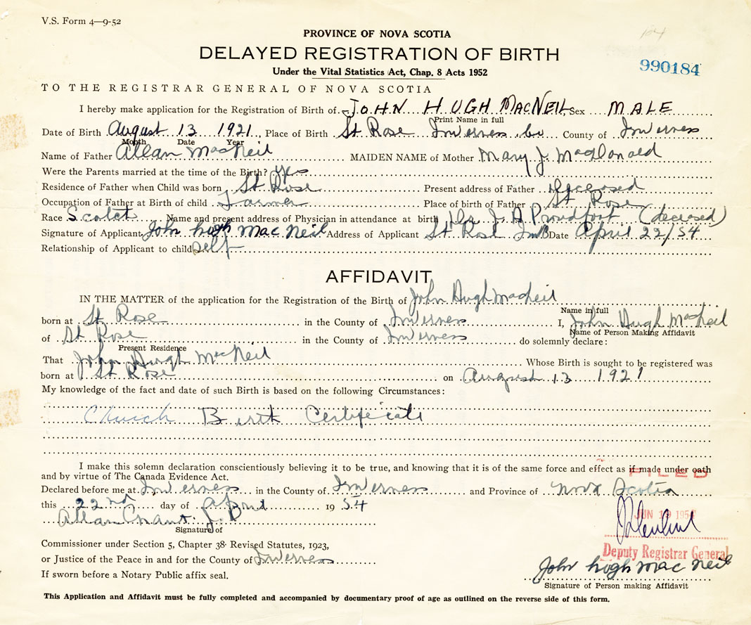 Signature of Applicant John Hugh MacNeil Address of Applicant St. Rose Date April 22, 1954
