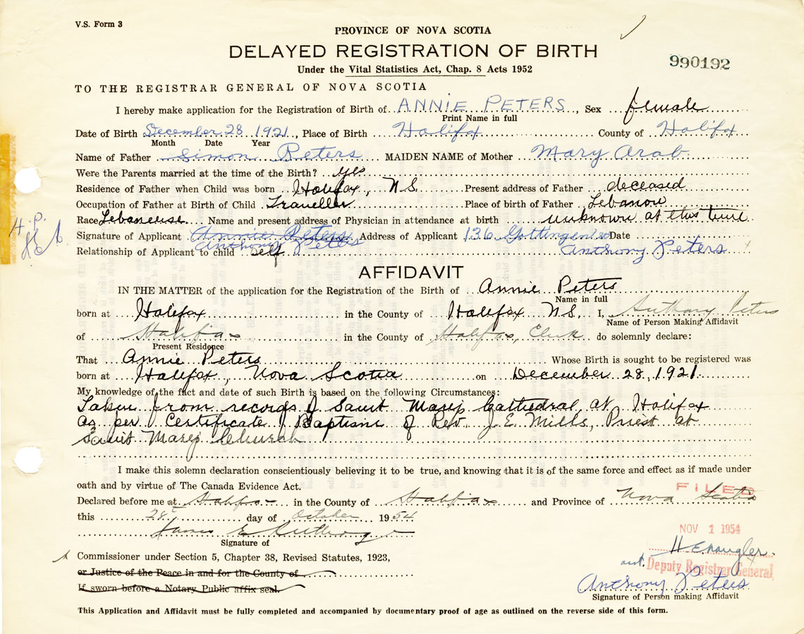 Signature of Applicant Annie Peters Address of Applicant 136 Gottingen St. Halifax Date October 28, 1954