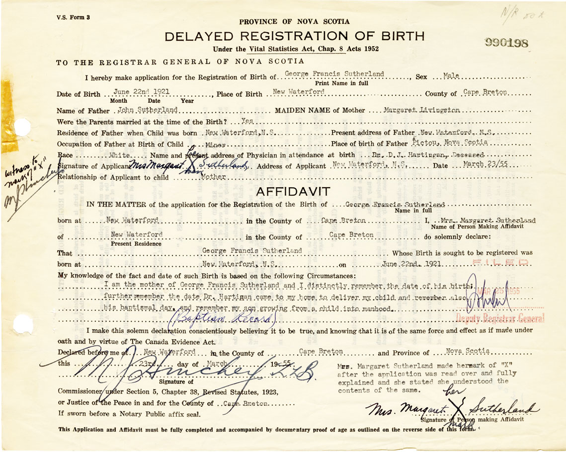 I am the mother of George Francis Sutherland and I distinctly remember the date of his birth furth remember the date Dr. Hartigan came to my house to deliver my child and remember also his baptismal day and remember my son growing from a child into manhood. (Baptism Record)