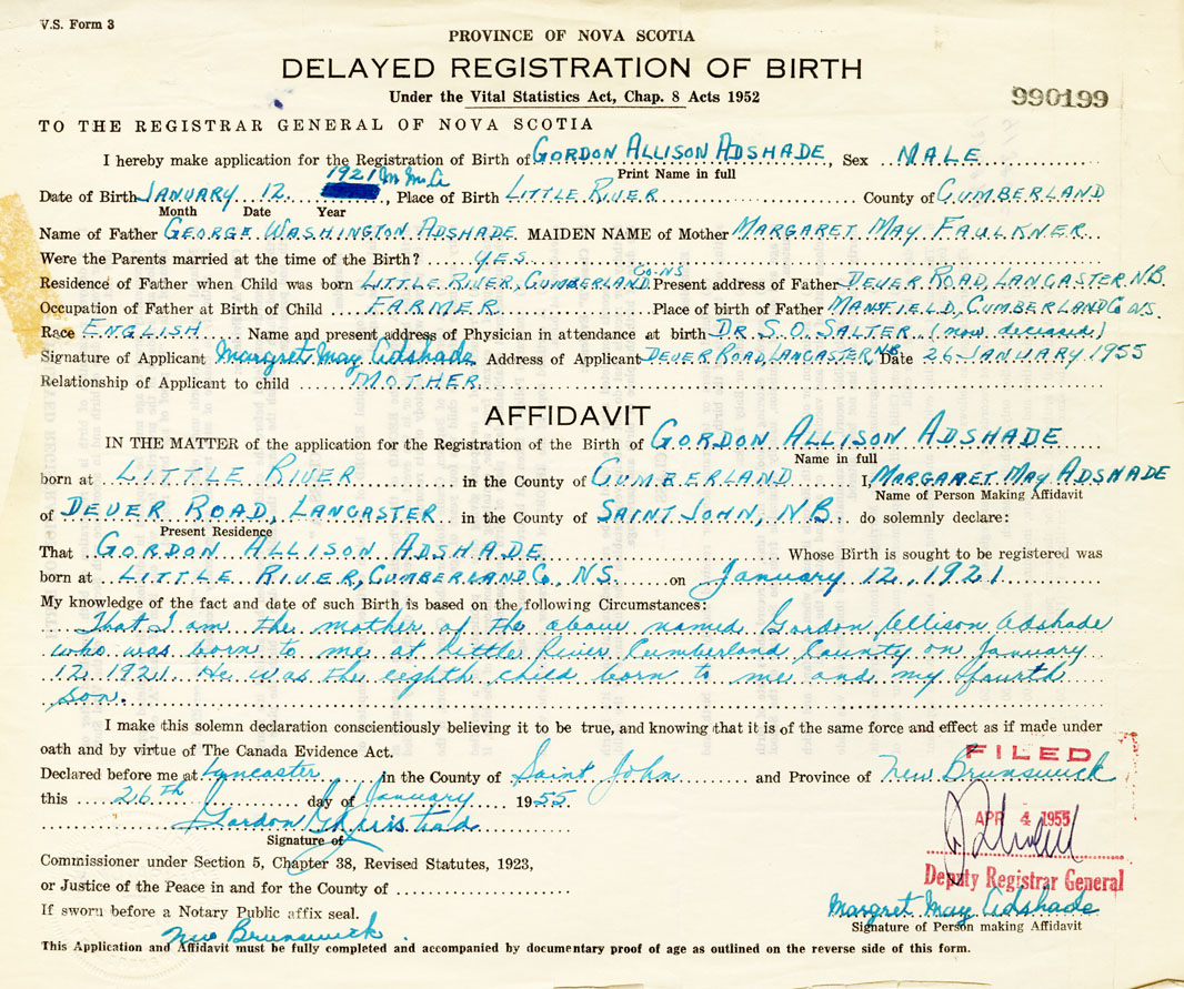 That I am the mother of the above named Gordon Allison Adshade who was born to me at Little River Cumberland County on January 12, 1921. He was the eighth child born to me and my fourth son.