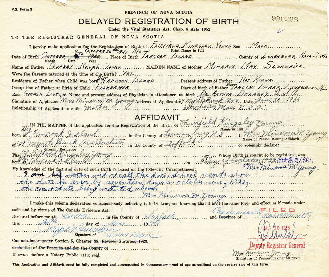 Date of Birth October 26, 1921 Place of Birth Big Tancook IslandCounty of Lunenburg