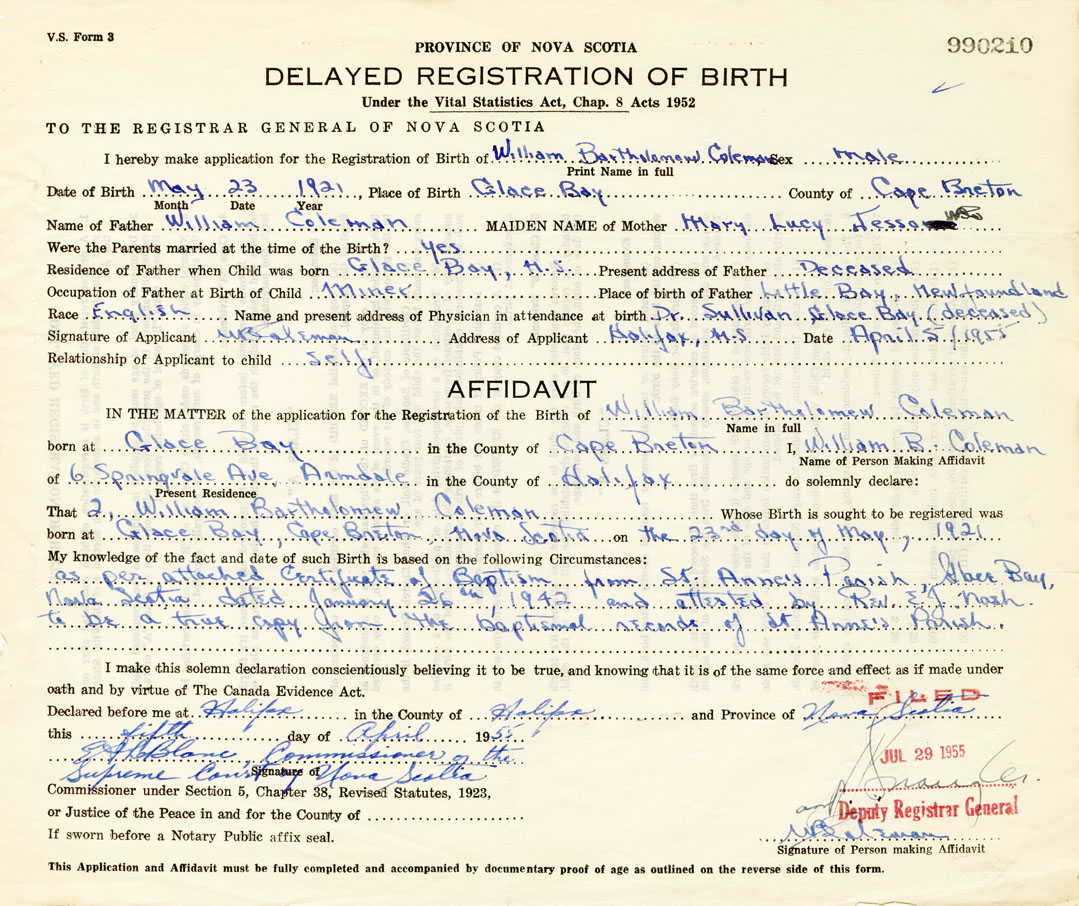 Date of Birth May 23, 1921 Place of Birth Glace BayCounty of Cape Breton