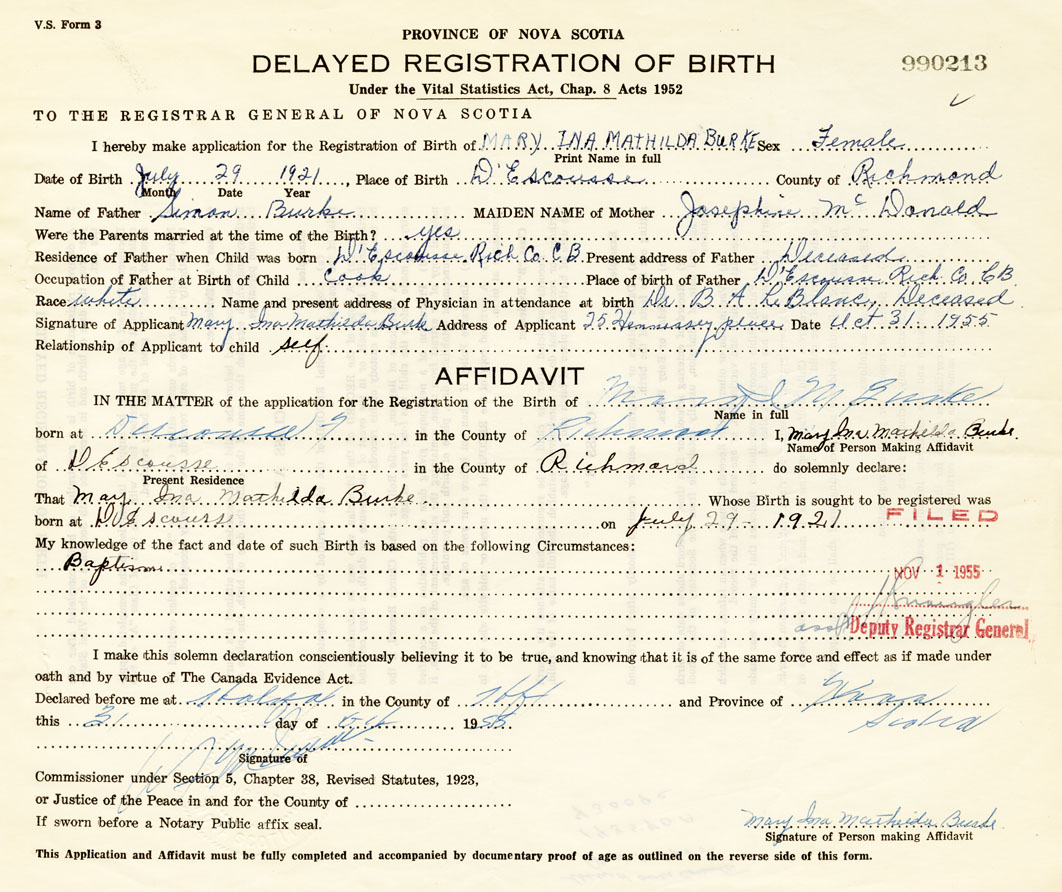 Signature of Applicant Mary Ina Mathilda Burke Address of Applicant 25 Hennessey Place Date October 31, 1955