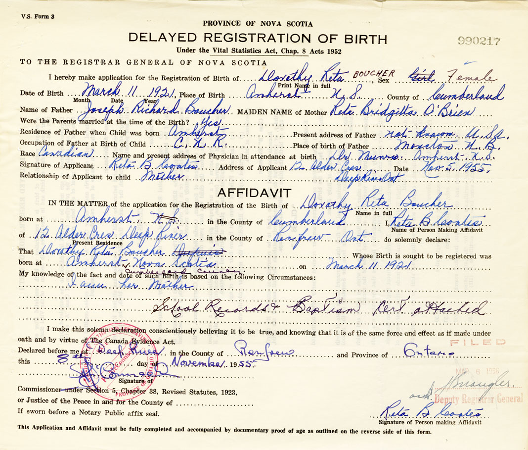 IN THE MATTER of the application for the Registration of the Birth of Dorothy RetaBoucher