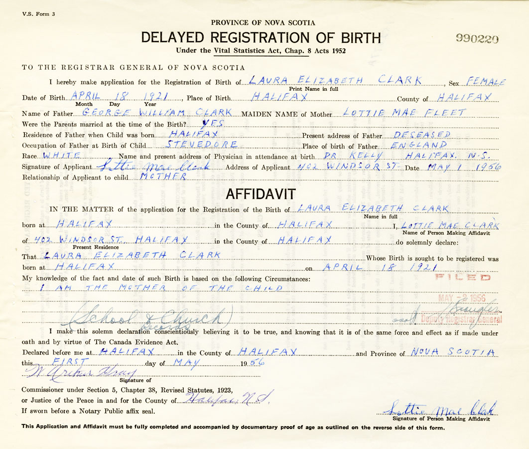 Signature of Applicant Lottie Mae Clark Address of Applicant 402 Windsor St. Halifax Date May 1, 1956