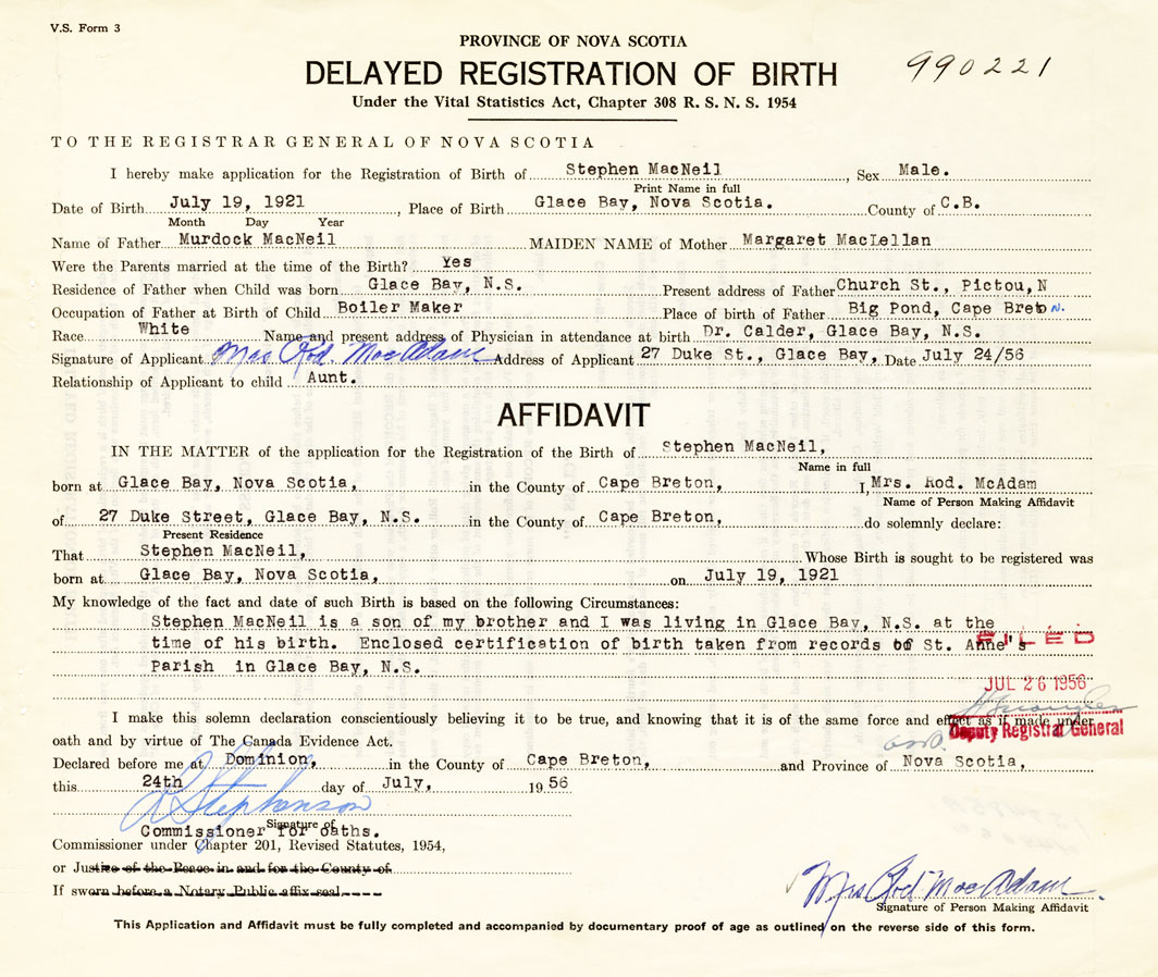 Stephen MacNeil is a son of my brother and I was living in Glace Bay at the time of his birth. Enclosed certification of birth taken from records of St. Anne Parish Glace Bay.