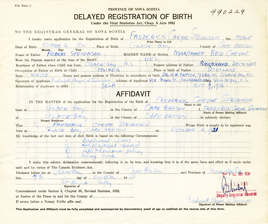 Signature of Applicant Frederick Cheyne Stevenson Address of Applicant 401 Fourth St. New Aberdeen, Glace Bay Date October 9, 1956