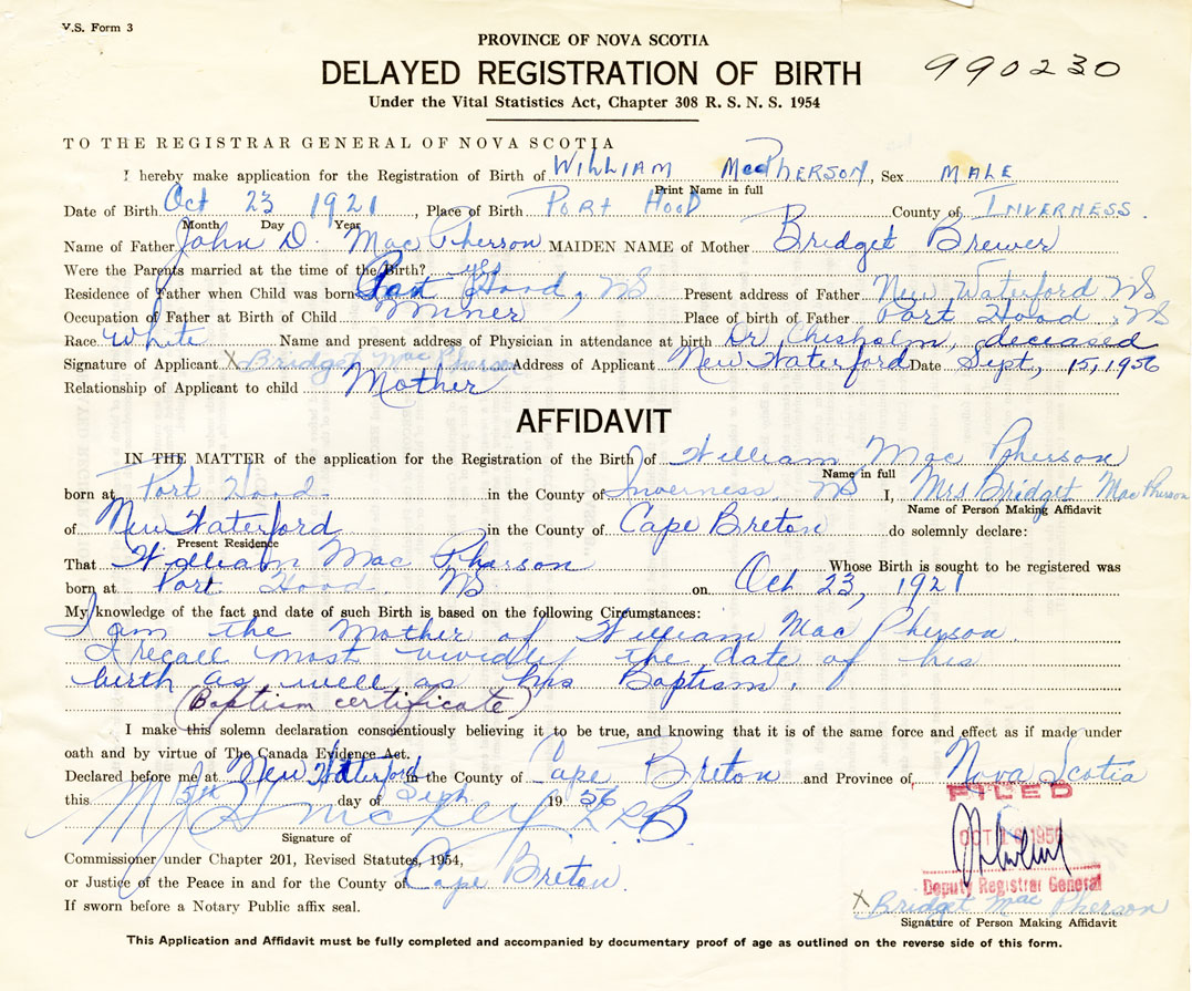 Date of Birth October 23, 1921 Place of Birth Port HoodCounty of Inverness