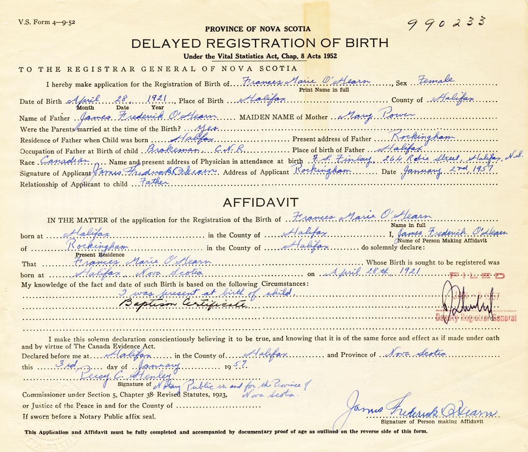 I hereby make application for the Registration of Birth of Frances MarieO'Hearn Sex Female