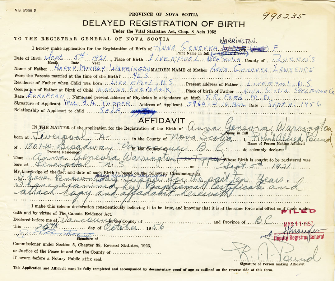 IN THE MATTER of the application for the Registration of the Birth of Anna GenevraWarrington