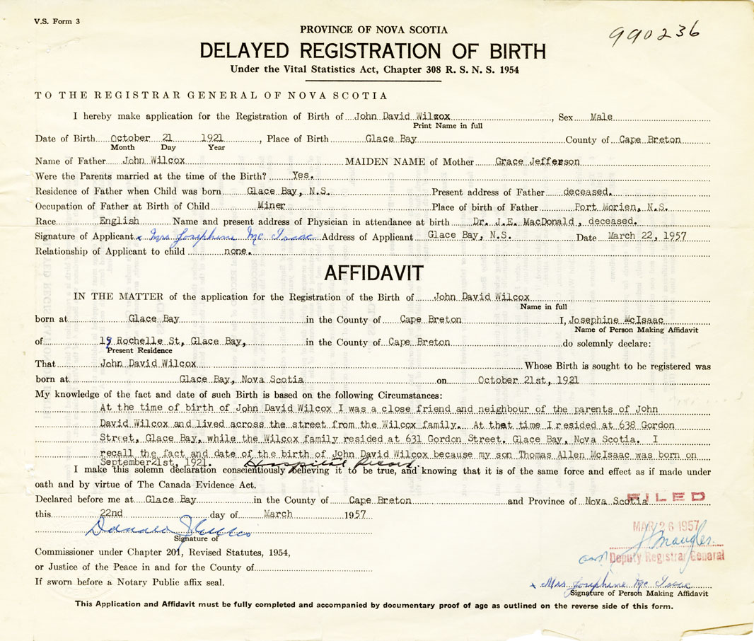 At the time of birth of John David Wilcox I was a close friend and neighbour of the parent of John David Wilcox and lived across the street from the Wilcox family. At the time I resdied at 638 Gordon Street, Glace Bay, while the Wilcox family resided at 631 Gordon Street, Glace Bay. I recall the fact and date of the birth of John David Wilcox because my son Thomas Allen McIsaac was born on September 21, 1921. Hospital Record
