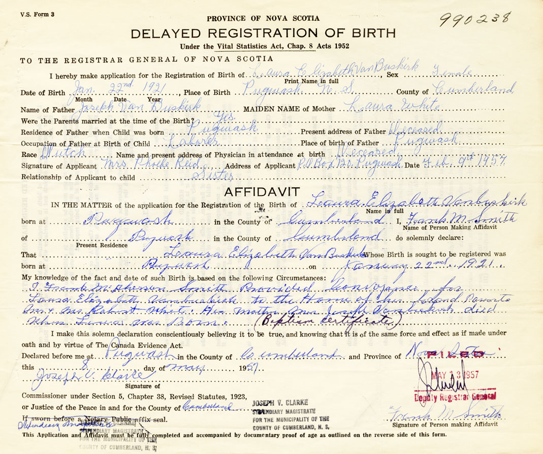 Date of Birth January 22, 1921 Place of Birth PugwashCounty of Cumberland