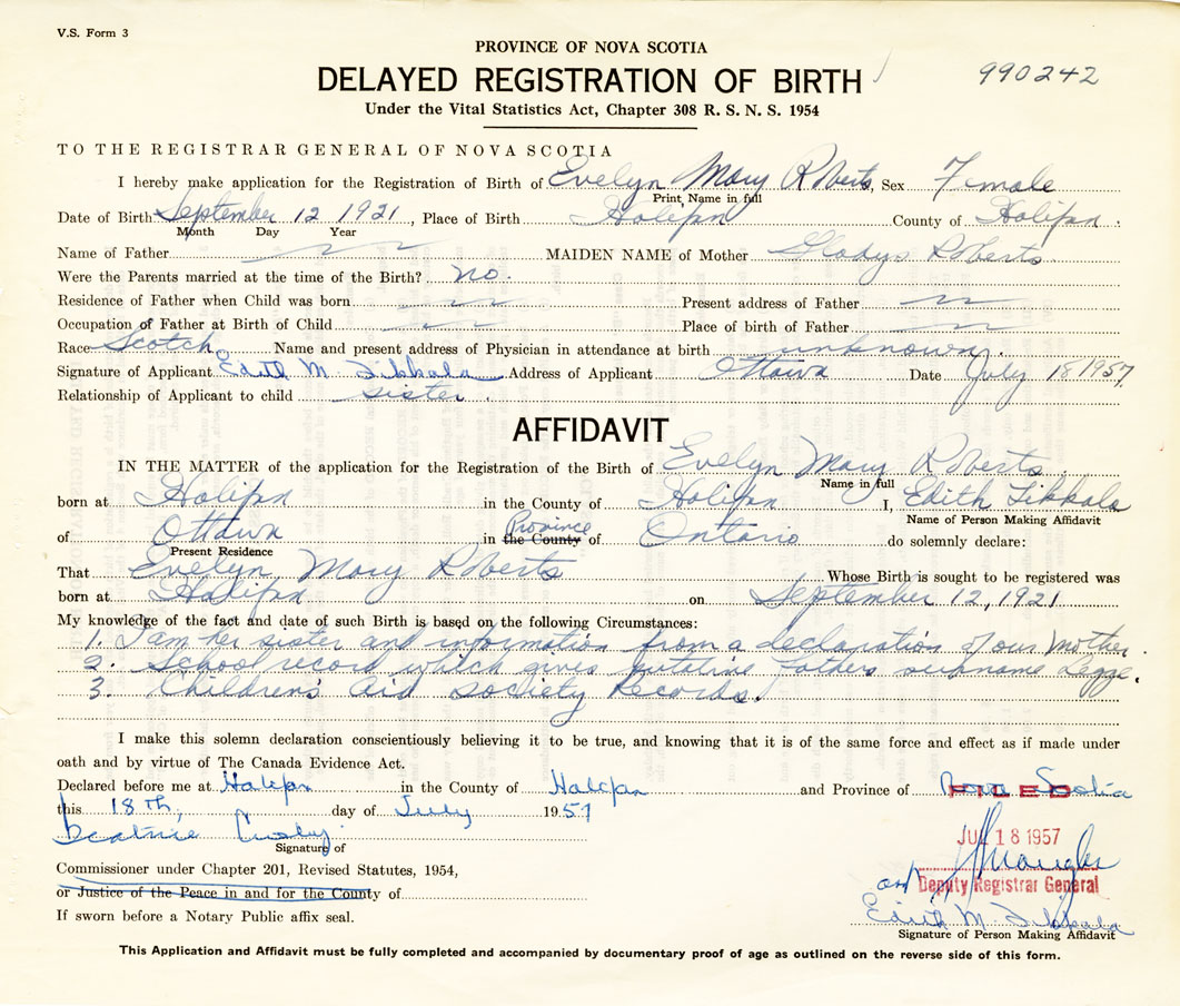 IN THE MATTER of the application for the Registration of the Birth of Evelyn MaryRoberts