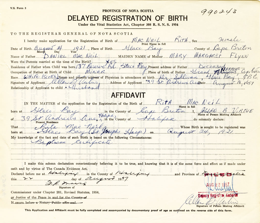 I hereby make application for the Registration of Birth of RitaMacNeil Sex Female