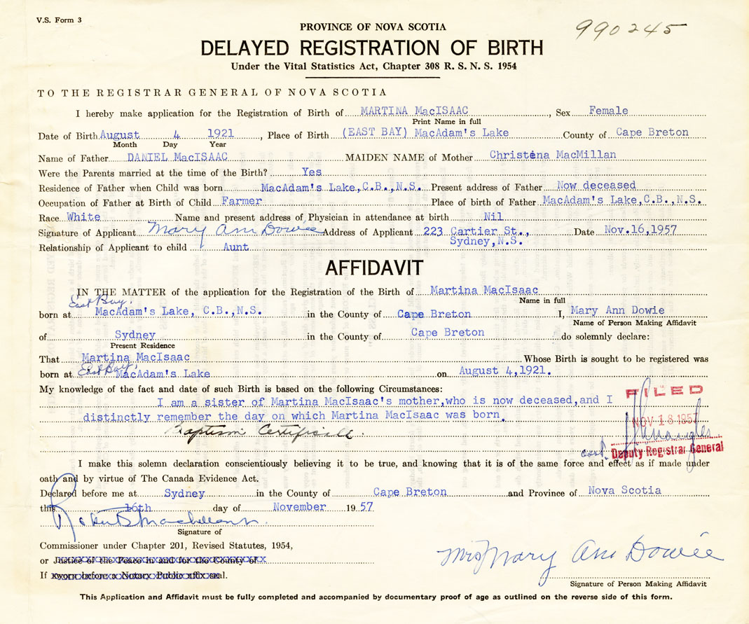 I am a sister of Martina MacIsaacs mother, who is now deceased, and I distinctly remember the day on which Martina MacIsaac was born. Baptism Certificate.