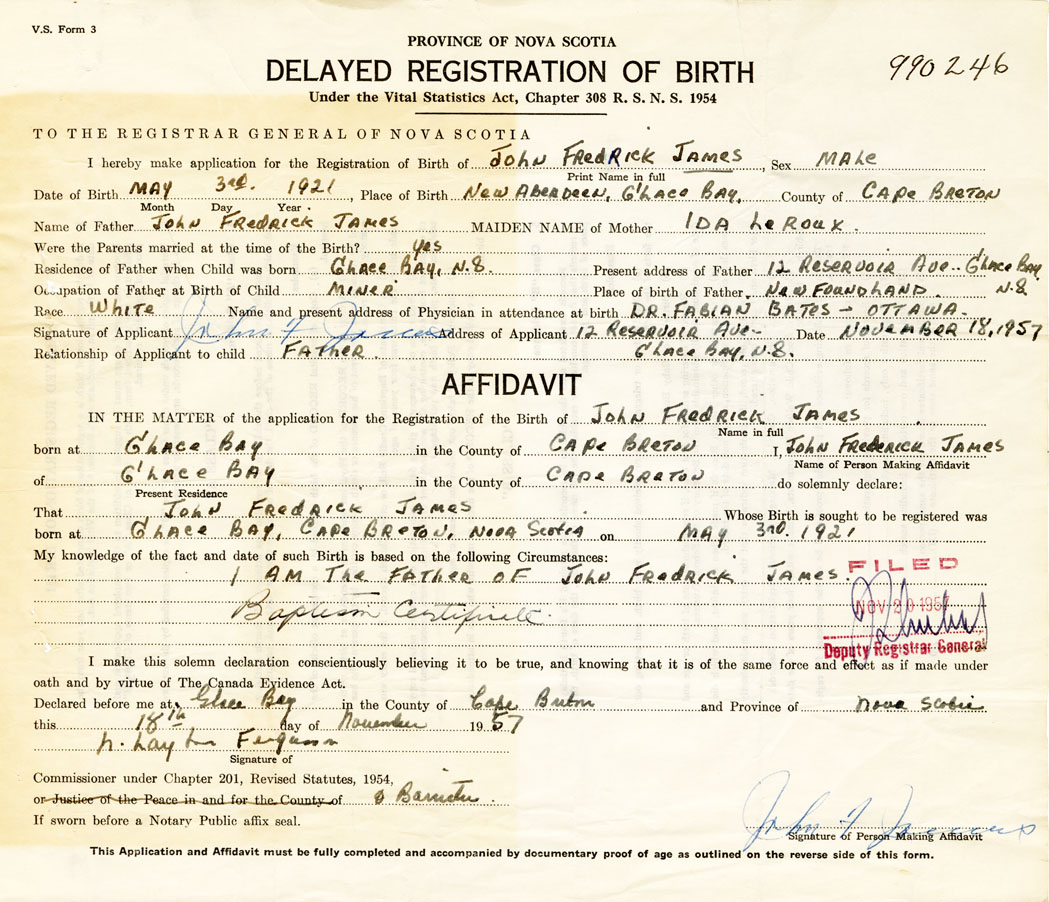 Signature of Applicant John F. James Address of Applicant 12 Reservoir Ave. Glace Bay Date November 18, 1957
