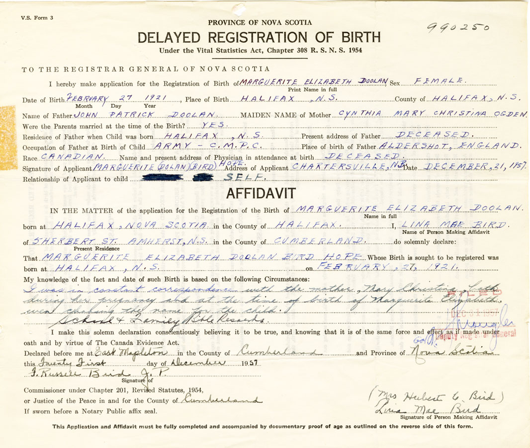 Signature of Applicant Marguerite Dolan Bird Hope Address of Applicant Chartersville, New Brunswick Date December 21, 1957