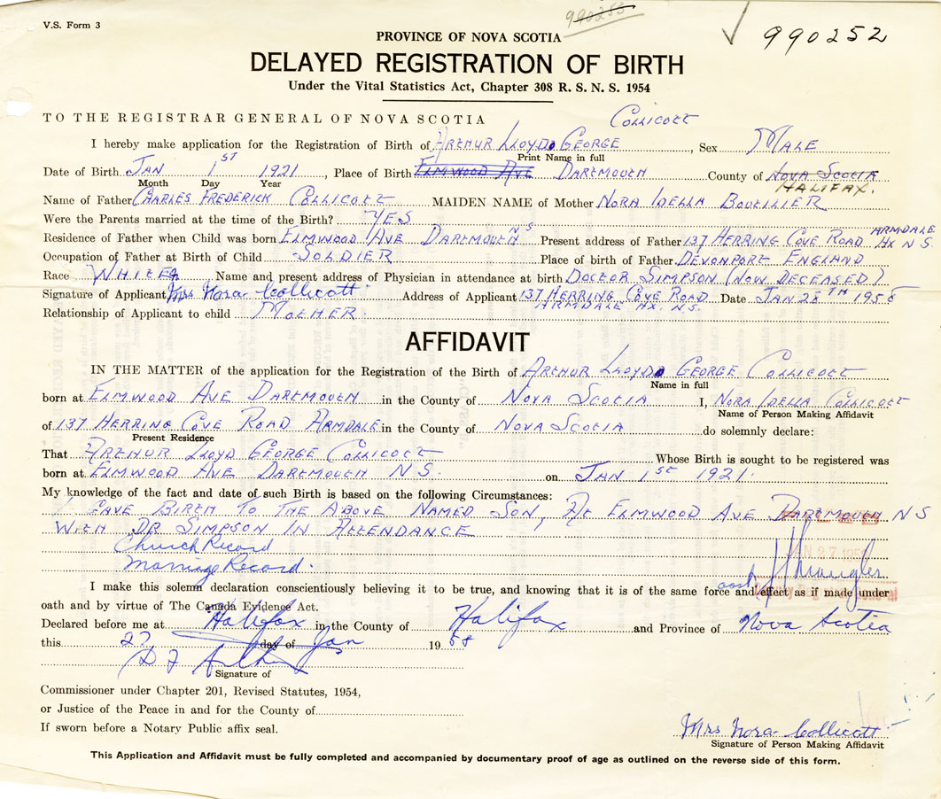 Date of Birth January 1, 1921 Place of Birth DartmouthCounty of Halifax
